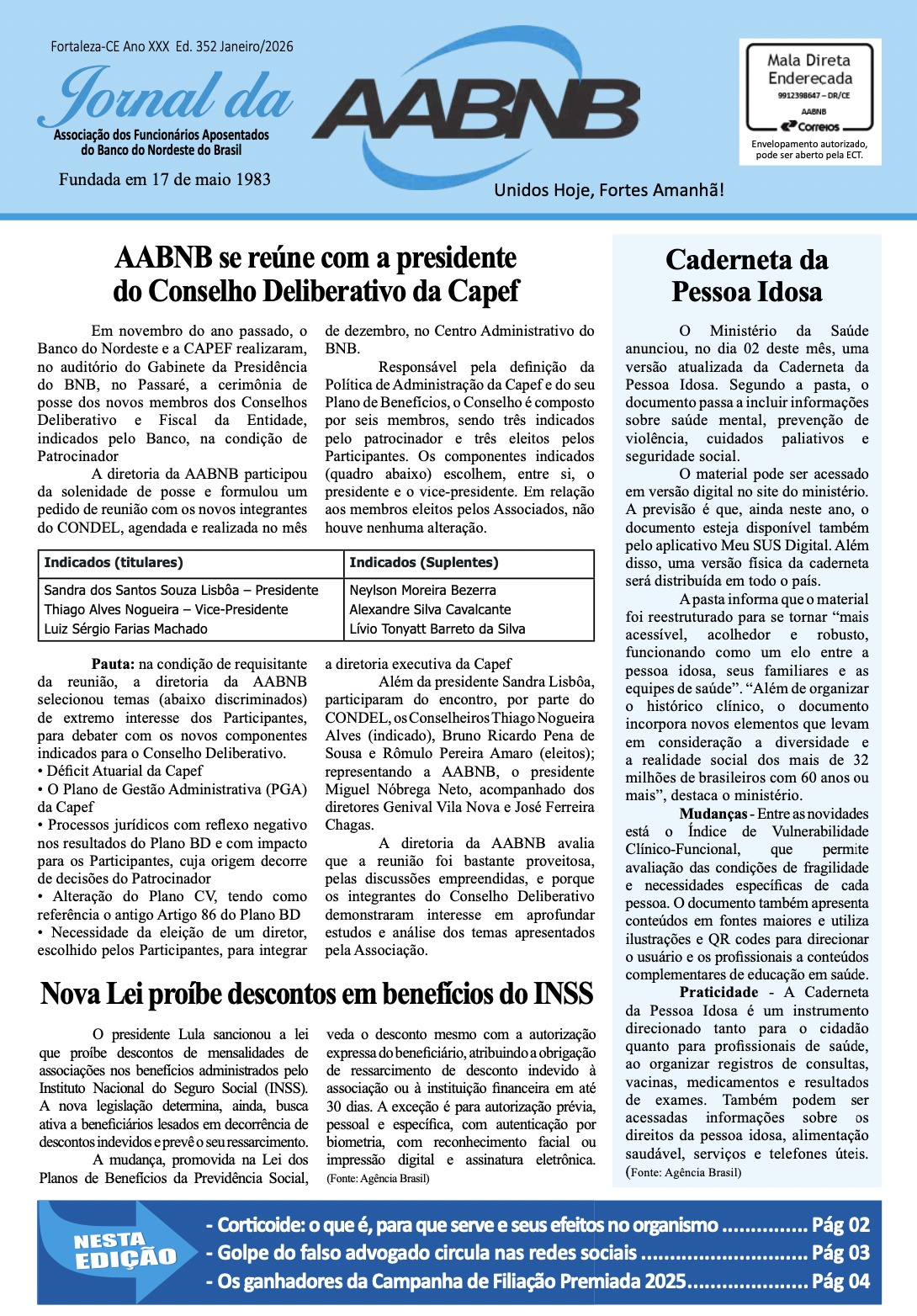 Caro(a) associado(a), Defender os direitos e interesses dos aposentados e pensionistas do BNB é a essência do trabalho da diretoria executiva da Associação. Para cumprir essa missão, a AABNB promove atividades de integração entre associados, fortalece a gestão administrativa e mantém diálogo estratégico com entidades, sindicatos e com os gestores da Capef e da Camed. […]