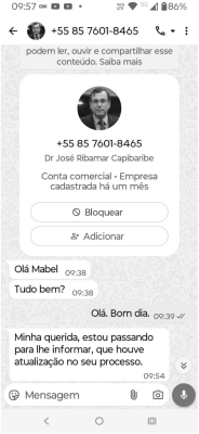O advogado José Ribamar Capibaribe, que presta serviços à AABNB, informa que golpistas estão usando o nome dele, indevidamente, na tentativa de aplicar o “golpe do advogado”, pelo WhatsApp. Confira, abaixo, uma mensagem enviada pelos falsários:
