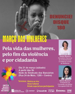 Reproduzimos, a seguir, o convite formulado pelo Sindicato dos Bancários do Ceará, para o ato em defesa das mulheres, que será realizado no próximo dia 21/3, na sede do sindicato,